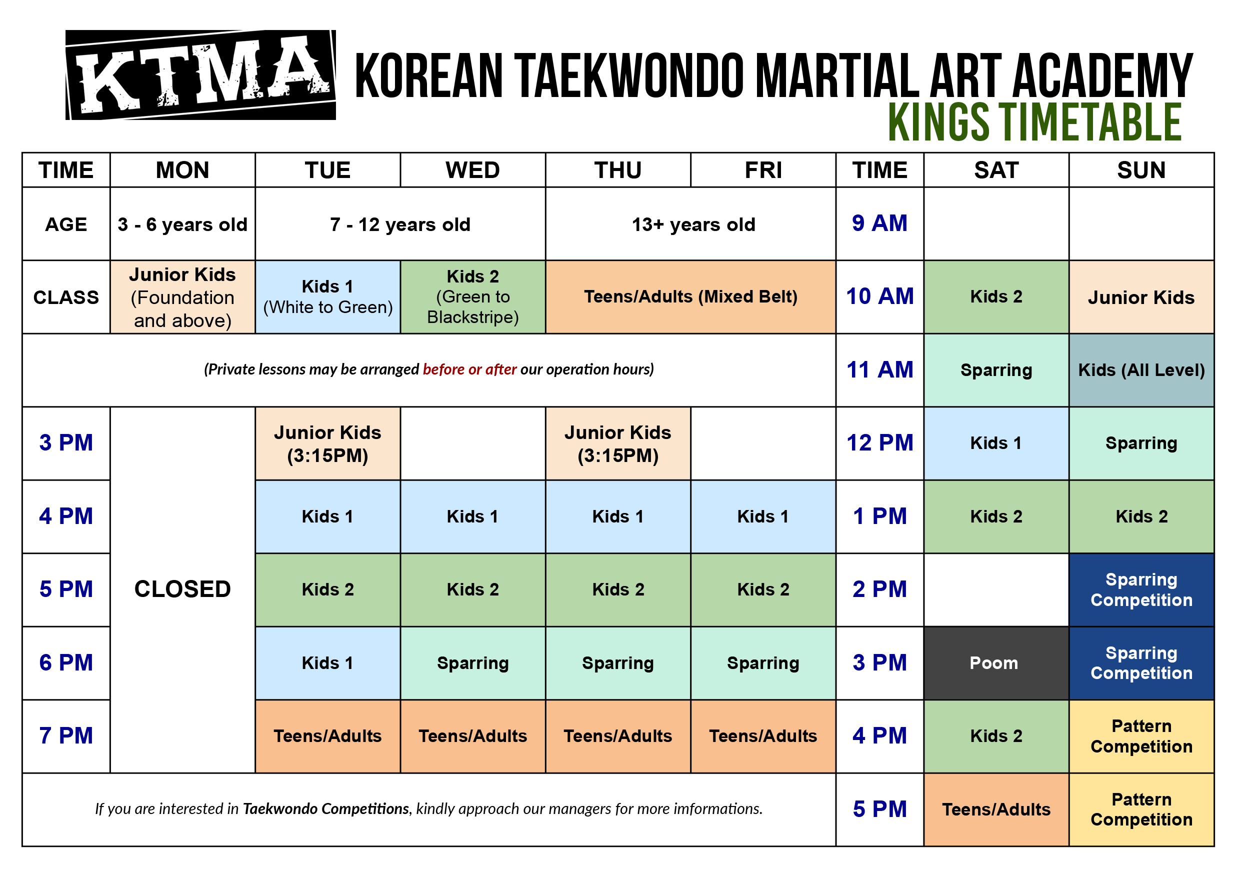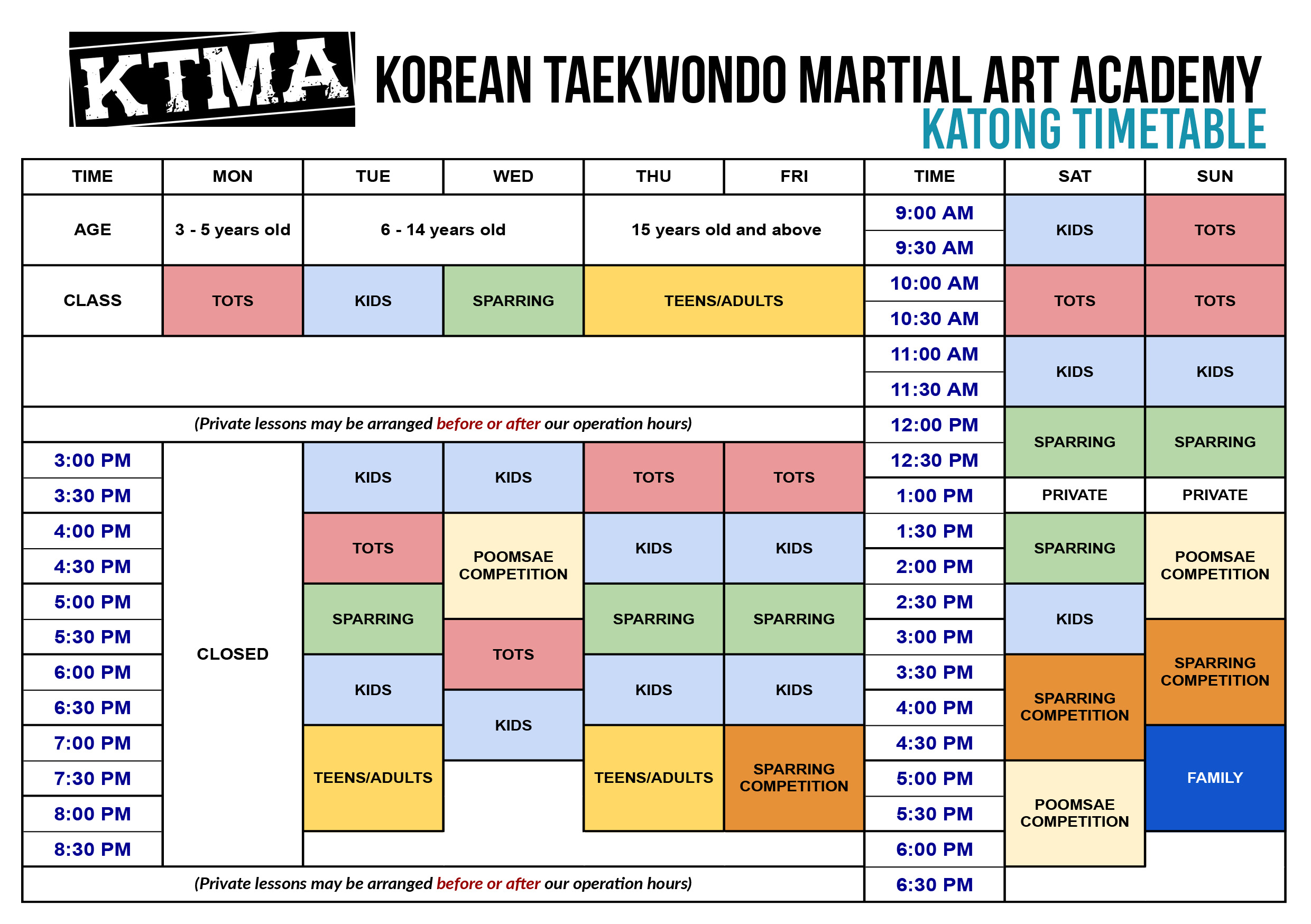 If you’re new and feel overwhelmed by all the different choices – Don’t worry. Let us choose the right fit for you. Our friendly staff will be more than happy to assess your unique situation and place you in not just the class with the right age group, but also the class with the right group of peers. With KTMA, you’ll never have to worry about feeling out of place!